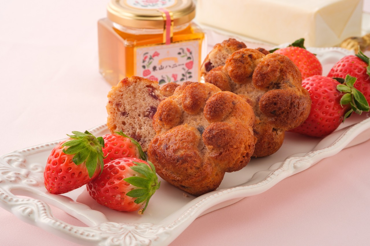 福岡県産のあまおう苺を贅沢に使用し、国産バターやハチミツをたっぷり使ったリッチなレシピでしっとり焼き上げました。
